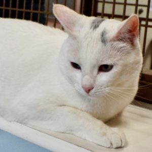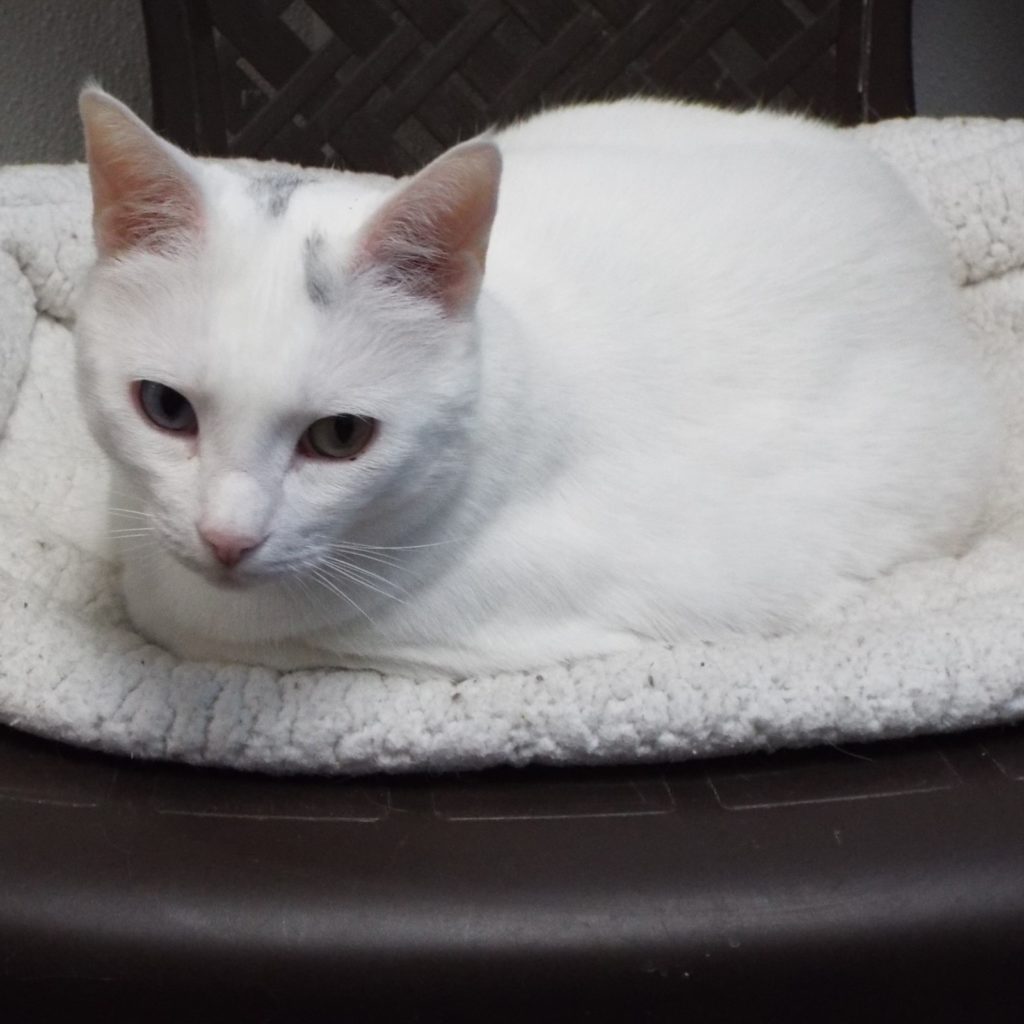 My last home was in a senior facility where I was kept in close quarters with other pets (including a dog). I didn’t like this, so here I am! My coat is pure white except for a streak of grey on my head. I’m a big girl and like being brushed. I’m getting used to my new environment, and I like to sleep on a cat tree. I think I’d do best in a quieter home where I had room to find my own space away from other pets. In the past I have sometimes shown my displeasure, but with the right home I think I could put this behind me.