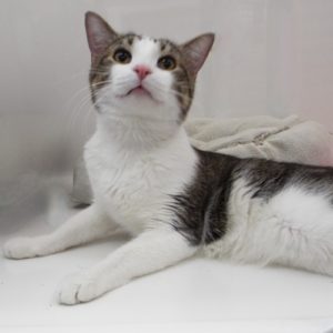 I was left at The Animal League with a batch of other cats, and we don’t know our history. However, I was given a clean bill of health and am ready for a new home! I like to sleep in an open wall cubby and am ready when the volunteers come in. They can pick me up. They pet me and brush me and I will move around to get more of it. My coat is a mixture of grey and white, and my tail is almost completely black. Handsome! Please come visit and check me out. At my young age I’ll give you lots of companionship.