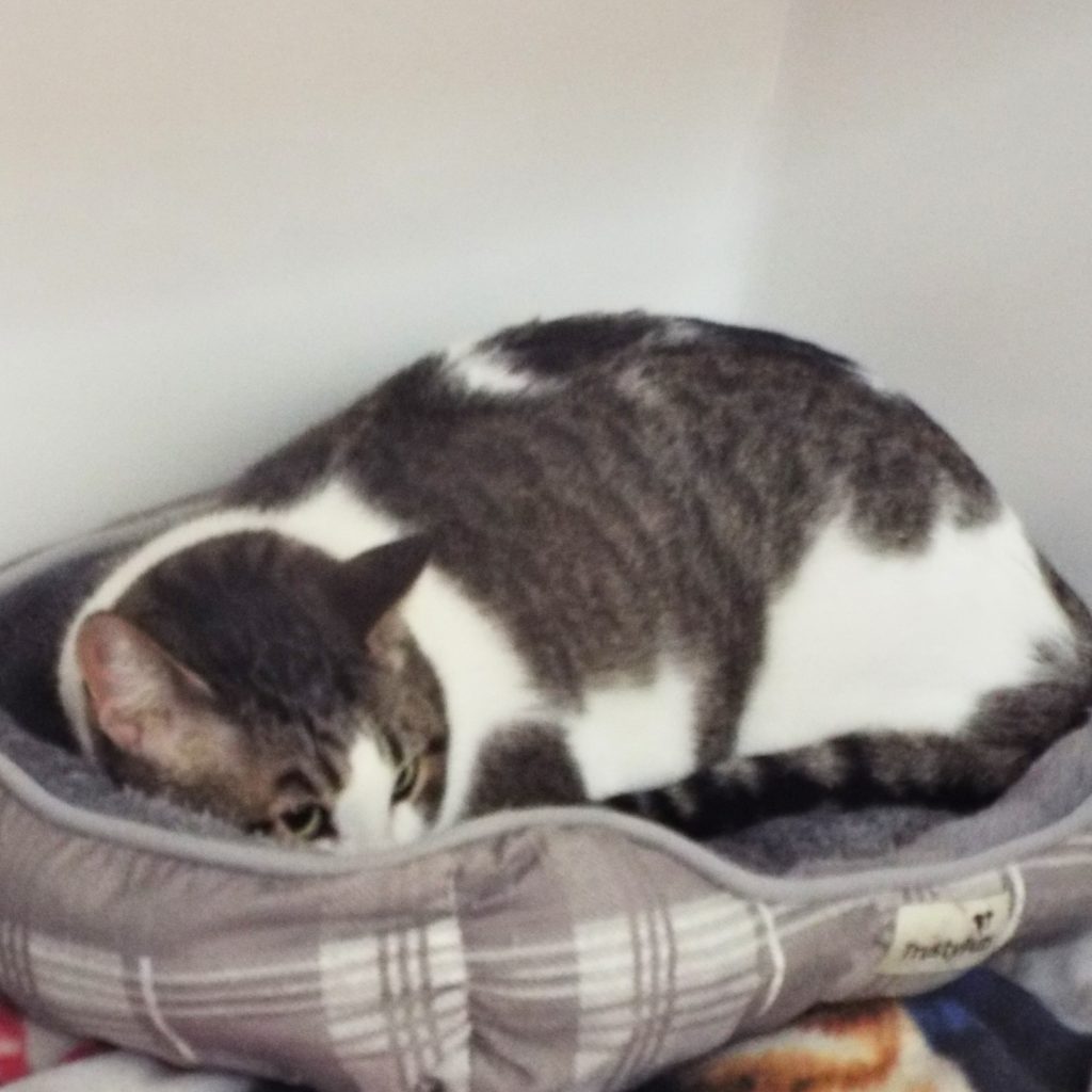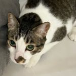 After mom passed away, we four cats were too much for dad to care for. We all came to The Animal League hoping for a new beginning. I quickly found the top perch on a cat tree and from there I can survey my new space. The volunteers come around to pet me and I crave their attention, rolling over to show my appreciation. I’m a big boy with a handsome tabby and white coat. My eyes have a mysterious green tint. I’m looking to start the next chapter in my life with someone who can shower me with love and chin scratches. P.S. No clue on my name…