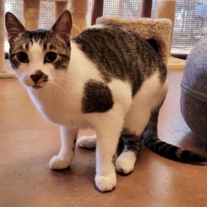 After mom passed away we four cats were too much for dad to care for. Almost a year ago we all came to The Animal League hoping for a new beginning. I quickly found the top perch on a cat tree and in no time I also found a new home. That didn’t work out, so now I’m back! The volunteers come around to pet me and I crave their attention, rolling over and purring to show my appreciation. I’m a big boy with a handsome tabby and white coat. My eyes have a mysterious green tint. I’m looking to start the next chapter in my life with someone who can shower me with love. (2-26)