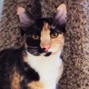 Several of us cats came into The Animal League at the same time with very unusual names. I’m one of them! Does that conjure in your mind a delicious entrée? Well, I’m “delicious” in a different way. I’m sweet and friendly. I love to lie on the high perch of the cat tree, but I also like to snuggle in your lap. My calico markings are so pretty, don’t you think? My yellow-orange nose and left cheek, along with my white chest and white paws help me stand out from other calicoes in the room. I DO know how to “work the room” because I’m in your lap as soon as you sit down! Come on in!