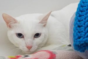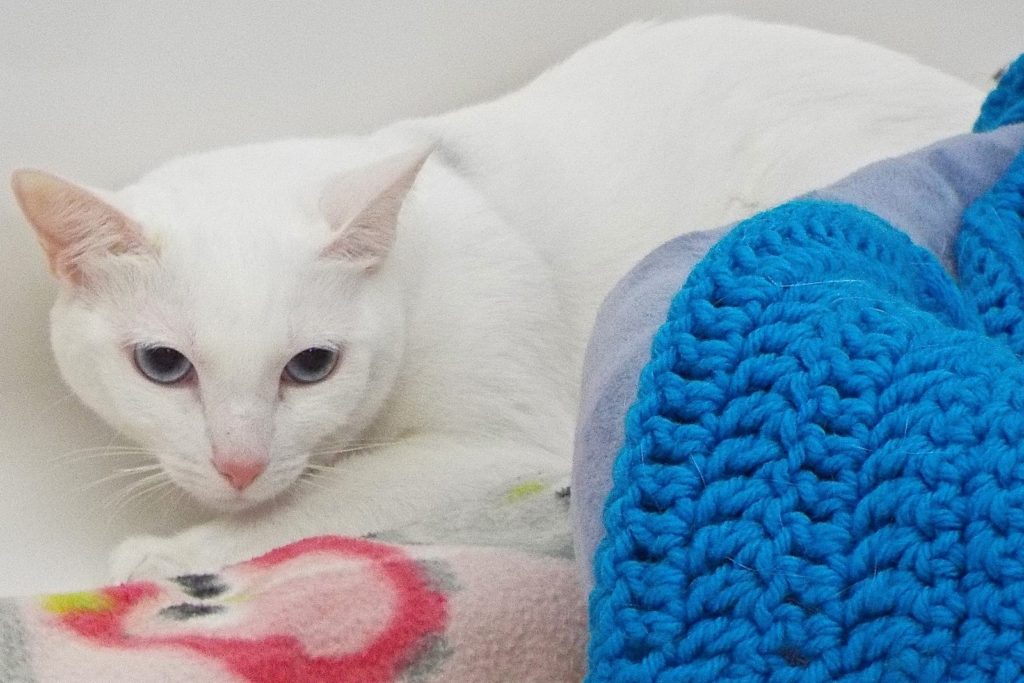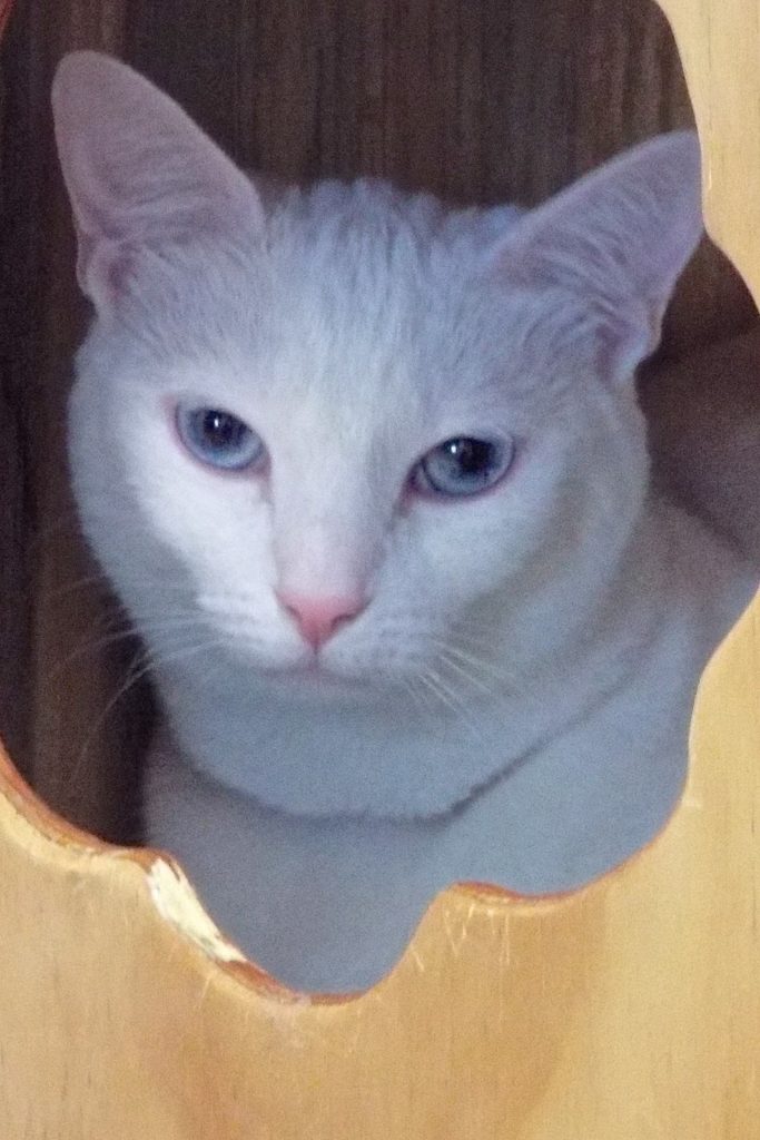 Unlike the “unwelcome guest” my name means in Gaelic, I’d like to be quite the opposite for you! I lived and loved the two dogs, cat, fish, and 10-year-old kid I lived with, but my teenage antics (which included some unwanted nocturnal explorations) were a bit too much for my mom, so she figured I’d do better in a more “quirk-accepting” home. She said I wasn’t at all picky about my food, was very playful, liked toys, sharing water and sleeping with the dogs, and snuggling with my kid, and am generally a “well-rounded” girl. When you add all that to my pure-as-the-driven-snow coat and blue eyes, well, what a package to brighten your summer!
