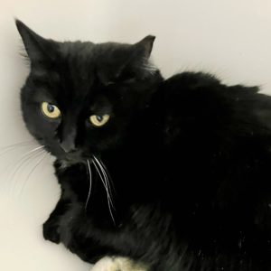 After spending a few years out and about, a nice couple took me into their home and I was very happy there for about 6 years. Unfortunately dad’s health is causing them to move and I can’t go with. While I was outside I tolerated certain other cats, but I’ve never had to live with any of them. I liked sleeping with mom and dad and they say I’m a real sweetheart. If I wanted to be petted I would tap their arm, or raise up on my hind legs to reach their hands. I’ve never been around children and probably not dogs, either. P.S. BK stands for Black Kitty!
