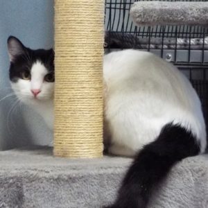 Such a petite girl I am with such an unfeminine name! I’m looking to change it. When you meet me, we can discuss that. You may look for me on my high perch, curled up napping. (My way of coping with the changes in my young life.) Since my family couldn’t keep me any longer, they brought me to the shelter. That was the right thing to do, but I miss them and my home. I’m picturing my new human(s) cuddling and caring for me, being the delight of the household. Is that your home? Remember: according to George Eliot, “Animals are such agreeable friends.” I surely would like to be your bestie!