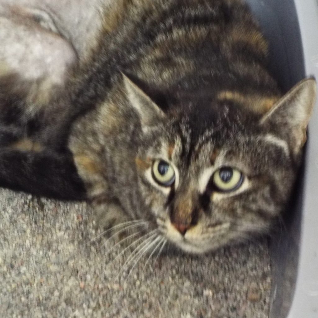 I was rounded up along with a couple of girlfriends and kittens, and I can’t tell you what my life was like before. Right now I’m not happy being here, and I express that by hiding in a corner and hissing. I can’t really complain about the food, though, and I am safe. Hopefully in time my attitude will warm up a bit once I realize how much better off I am. I’m a pretty grey tabby girl. For now I could use a quiet home with a human that has patience to spare. I promise I’ll try my best!