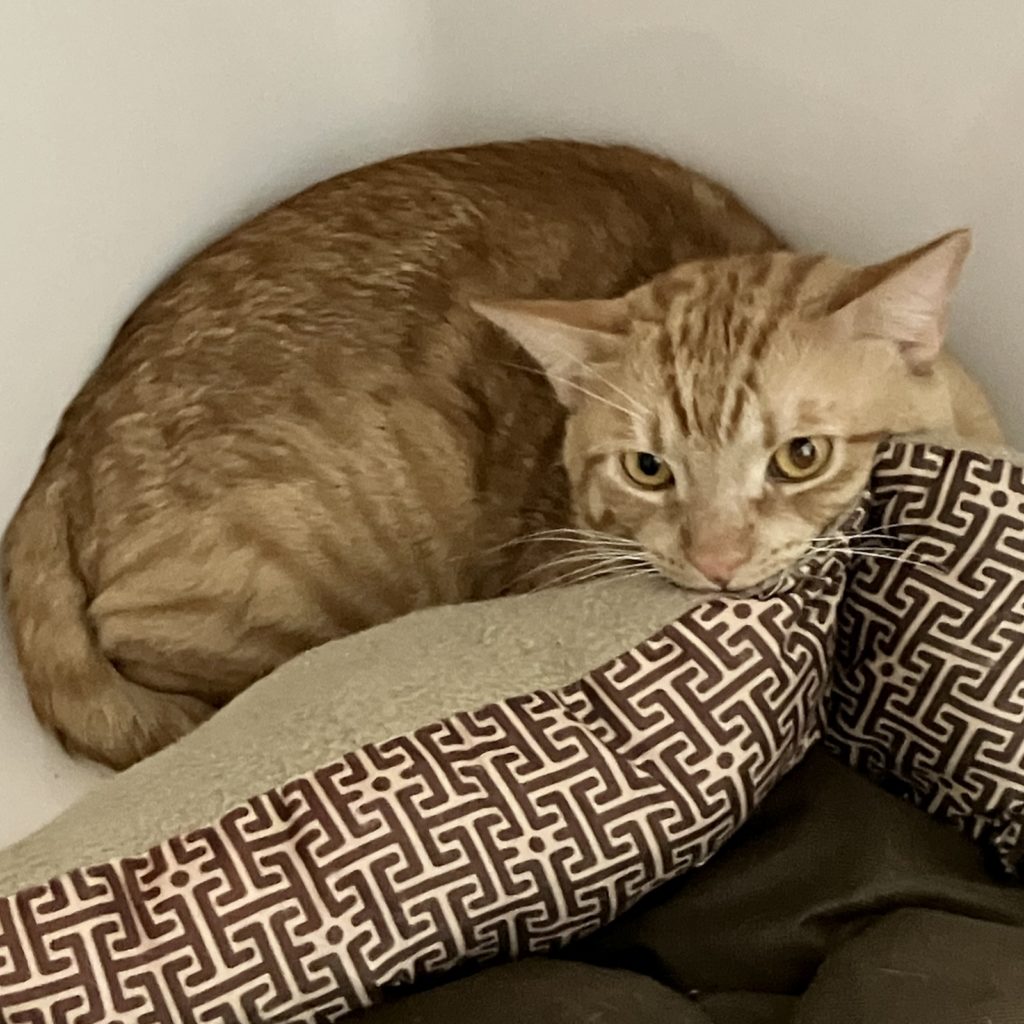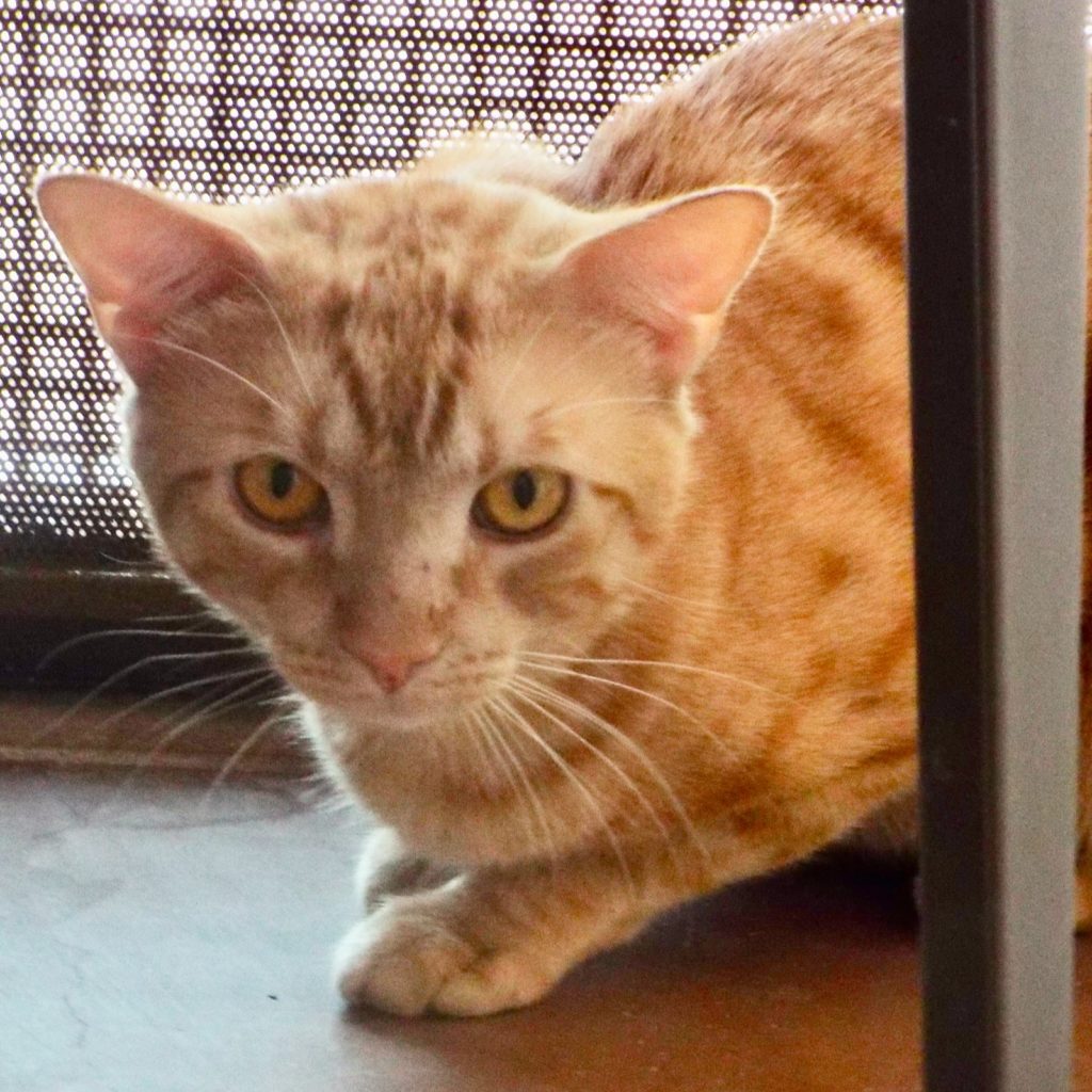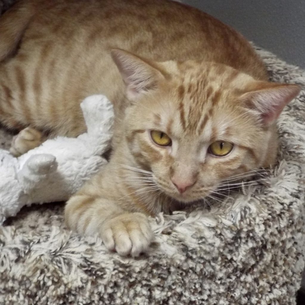 Dad moved to a place that didn’t allow pets, so here I am with my companion, Sadie. Dad says I’m shy at first but then I’m cuddly and friendly. I like sleeping on your bed. Here I’ve been sleeping on a perch of a cat tree, but I’m still getting used to the attentions of volunteers. I’m a handsome orange tabby boy who’s hoping to find the right person who wants me to join their home. Will you come and meet ME? I know I can be shy but you can help me feel comfortable. Give me a chance?