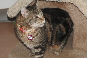 You know how humans describe body types as “apple” or “pear” shaped? Well my housemates, Luchen, Celine, and I might be described as “footballs!” That’s not to say that we’re MEANT to be that way, it’s just what happens when you get too much food and too little exercise! Our mom left us (and four dogs!) with HER mom when she moved, and since she already had five rescues, well, you can imagine it was a smidge crowded! But our home was a happy one, and we got along with everyone – especially people – so I’m hopeful that my rumbly purr and furry rubs will convince you that there’s just more of this lady to love!