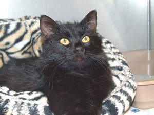 Here’s what they knew about me when I was found with a crudely lettered note: “Two years old, very sweet, very pregnant, her name is Delila.” Not a whole lot to go on, but they got it all right – I was/am all those things! I lived with a wonderful volunteer until my babies were weaned, and she said, “Delila is an absolute love. She adores being brushed and scratched, is crazy for belly rubs, and will sleep above your head and warm yours ears on cold winter nights [I was found in February!]. She’s black with a beautiful chocolate undercoat, so we’re thinking she’s a Chantilly cat.” Well, I’m very special in any case, so why not make my foster mom’s day and give me a home as wonderful as hers was!