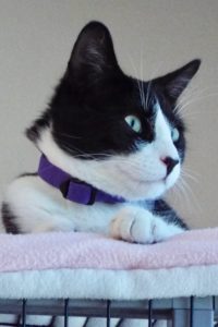 Same old sad story—Mom is moving and can’t take all her pets—so here I am! I’m still growing and have many years to make your home more fun. In keeping with my sex symbol name, I’m a cute boy in a tuxedo who’s dressed up and ready for the future. I love playing with toys and running around.  You can pick me up but I’m much too busy to want to spend too much time in your lap. When you come to meet me look for me on the cat tree, and step right up to say hello. To seal the deal just bring some kind of toy, and I’ll be yours.