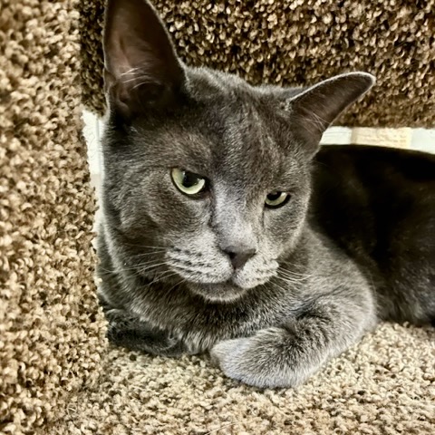 Here’s my story and I’m sticking to it! According to my records, I used to live in Idaho. I don’t know when I moved to Arizona or how I was lost. An observant human saw me hiding out in a drainage area. She brought me to The Animal League where I’m safe. I’m a big, sweet boy that likes to cuddle, play in paper bags, and follow laser light toys. I’m a Russian Blue, therefore I’m intelligent and loyal. I also love affection. My coat is plush and dense. (I don’t shed much.) I’m up to date on my shots and ready to go home with you. Are you adopting today?