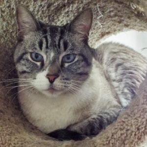 My owner gave me up and now I’m looking for another chance at a happy home life. I’m a beautiful grey tabby with white on my face and chest, and gorgeous blue eyes reflecting my Siamese side. TALGV volunteers say I “lean into” petting and scratching, and I like to survey my room from a high cubby on the wall. I’m just getting used to things, I guess. Will you come meet me and get acquainted? I’m betting we could find some common ground, of the “you pet me, I purr” variety. I’ll wait for you in my room, just look up high.