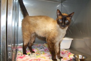 You won’t find many stray cats that will follow a dog home, but that’s just how I got to my rescuer’s house! I guess that means either that I’ve lived with a dog in my other life or else I’m just a typically outgoing Siamese boy (or both!). At any rate, since I couldn’t stay with the family that found me because of allergies, here I am — sitting pretty and getting lots of food and attention (and spiffing up — I was a tad, uh, “ratty” when I arrived!). They think I’m only about three years old, so just think of all the years we’ll have ahead of us to share our stories of derring-do! If you “speak Siamese,” we’re gonna be happy as the proverbial clams!