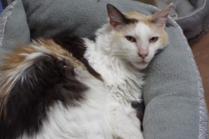 When you come to meet me, you may find me cuddled in a cubby, but I would MUCH prefer snuggling up to you! My human mom said that I’ll talk to you if you tell me I’m lovely (and I AM lovely!). I am a quiet, laid-back, loving lady who likes gentle treatment. Limited brushing is fine, but if handled too roughly, I have no qualms about letting you know! So that said, it’s probably best for me to be in a quiet home with no children or dogs. Although I came in with Pippin, we aren’t found together often. Please come meet me so I can charm my way into your heart and home!