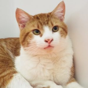 When you look at me you’ll see that I still need to grow into my feet—they’re big! I’m not sure how much more growing I have to do, so maybe I’ll just keep them as is. Anyway, you could call me a family man. I was in a home with several children, other cats and dogs. Given a choice, I liked to sleep with the kiddies. I like to play, and I’m also gentle and loving. I like attention and don’t mind being picked up and fussed over, and will purr my thanks. I’m a handsome orange and white boy with a friendly face. If you need a family addition, come meet me.