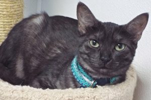 If you’re looking for a lovable and charming kitten, but aren’t quite ready for a hyperactive young’un, well look my way! My mom adopted my brother, Heath, and me when we were just wee critters and we provided her with lots of excitement (maybe a smidge too much!), but when her health necessitated a move out of state for treatment, she had to return us. I’m an extraordinarily lovely girl with unusual sleek, smoke-colored fur, which matches perfectly with my extraordinarily gentle and loving nature. As a teenager I still love playing with toys , so I’ll bet your whole world would be ever so much happier with me in it!