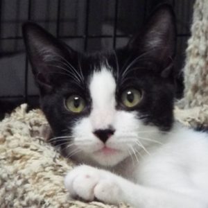 I think I’m the perfect package—sweet and playful, with a handsome black and white coat! My foster moms all agree. I was the smallest of my siblings and made up for it by being the most affectionate. I love to be held and petted and will purr my way up your chest to your neck. I’ll roll over like a dog, if you will only pet me! I have my playful times too, but will always stop for human attention. If you are looking for just such a perfect package, please come meet me. I will greet you warmly and try to charm my way into your heart.