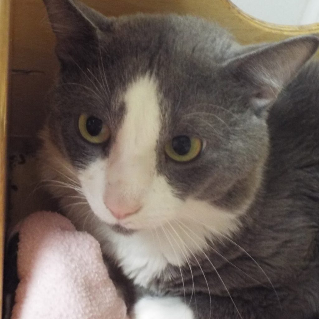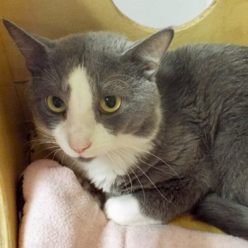 When the folks decided they had too many pets, three of us cats came to The Animal League. We’re all taking time to adjust to our new digs, and it’s been a little rough. I spend my time in a wall cubby and the volunteers are able to stroke my body with a wand, but brushes scare me too much. I’m a young boy with a mostly grey coat with patches of white. What would suit me best is a quiet home with a patient owner who could help me feel safe and let my better nature come out. Could you give me a chance?
