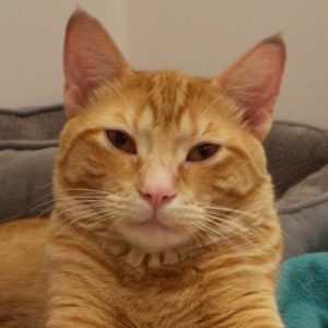 Can you see me smiling? I’m one happy cat, happy to have been brought in from the streets. I love people and attention and I lay by the door to my room to intercept anyone coming in. I will roll over for tummy rubs and I like petting and brushing too. I will lay down near you and touch you with my paw to show you that you’re mine. I like to play, but be aware that I can play a little rough. I’m a super-outgoing orange tabby boy with coppery eyes that would love to brighten up your home.