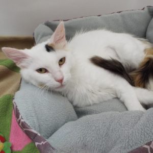 I brought my kittens into my rescuer’s courtyard in Tubac, Arizona, so that we all could be safe. She cared for us until she took us to a shelter. Since I was a friendly mama who needed her own home, I came to The Animal League. I’m a teeny young girl who needs your Tender Loving Care. I’m somewhat shy. I need to be fed daily without having to scrounge for my food. My fur garment is lovely white with a calico tail and a beauty mark by my left ear. I appreciate the safety, food, and naps in a domed bed here. I bet you could provide that in your home, right? Please come meet me!