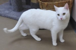 Whew! Did I ever dodge a bullet! A wonderful woman rescued me from a “kill” shelter just a day before my time was up because she KNEW with my personality, unusual looks (not too many all-white cats out there), and loving, playful ways, I’d make anyone a wonderful companion. Thank heavens there are people out there like that! She said I liked to sleep (and purr!) next to her, have a soft Siamese voice that tells you I’m happy, am very “respectful” with a mellow temperament, am great with other cats, and love hanging out and cuddling on the couch. With all those attributes, you know you can’t go wrong, so get ready to fall in love!