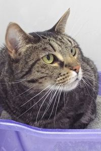 I suppose the arrival of a child was a joyous occasion for my dad when his girlfriend and baby moved in, but it wasn’t a banner day in MY book! We’d been best friends all my life (he adopted me from here, where, I’m pleased to report, I was notorious for teaching all the other kittens how to open doors and roam the halls!), so I must admit I wasn’t happy about sharing his affections and gave him a couple ankle nips to remind him. Although I’m initially shy with “real” people, I promise to be a quiet, loving companion, spending my days keeping you company and trying to live up to my name.