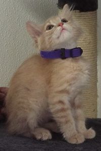 LOAFER is the “runt” of the litter and also the most hilarious kitten ever. He kinda looks like he was struck by lightning with his wild fur going every direction. He is a soft buff orange with a little pink nose, and a total charmer. He thinks he is much bigger than he is, and realizes it every time he tries to jump on a chair or couch. When Loafer plays he bounces around like a bunny, punctuating each hop with a little squeak. You probably can’t handle the cuteness.