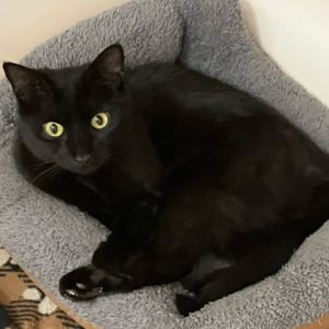 When my family moved, they couldn’t find me…so I was left behind, outdoors. I don’t know why but they couldn’t come back for me. I have so much to offer: I’m affectionate, will jump in your lap, and I really respond to brushing. I will approach you to greet you when you enter my room. My black fur is shiny and sleek, just like a polished black patent shoe. My eyes are a luminous yellow. I like to play, too! What else could you need? I’m waiting to meet you and I hope we can set up house together soon (indoors only, of course!).