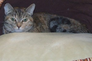 Despite my current anxiety about my life’s changes (my mom passed away recently), her daughter said that I’m really a delightful girl who can be laid back or playful — depending on my mood. She said that I love chasing balls with bells inside, am a “very clean litterbox girl” who likes to be “neat and tidy,” and love to have “daily chats” with you. I’ve been living with my siblings, Paul and Carlos, and adore them mightily, so staying with one or both of them would be SO nice (and make our transition into a new life a lot easier!). I’m a diminutive tabby/ tortoiseshell mix who loved sleeping with my mom at night, so if you’re looking for a bed partner of the feline kind to purr sweet nothings in your ear, I’m your gal!