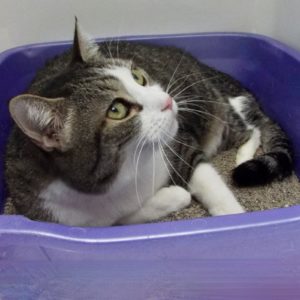 I lost the only home I knew when mom died suddenly—my world has been turned upside-down. I’m adjusting to being here, mostly sleeping on a high perch on a cat tree. I’m enjoying the attention from the volunteers, especially the petting and scratching. I lived with another cat and seem to get along with the cats here too. I have a mostly grey tabby coat with white on my head, neck and paws. I’m hoping to start a new chapter in my life and be a companion to a new human. If you think it could be you, please come meet me!