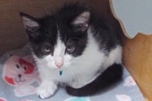If you’re looking for someone to play with, look no further! I live to play with any kind of toy or with another cat. I have lots of energy and when I get wound up, I dash around the room making little trilling noises. When I have to slow down and sleep, I like to sleep on your legs. I am excellent at using the litter box and my favorite food is Friskies Liver and Chicken (I can pass on the Poultry Platter). One unique thing about me is that my legs are all white, but I have one black toe! I’m ready to make your home my own and I promise lots of fun.