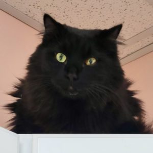 I’m as dark as a moonless night, but I have the softest fur in town! I’m waiting for a new place to call “home” since my humans could no longer care for me. My long coat needs daily grooming – and not just from me! Also, I’m a special kitty with a condition called FIC (Feline Idiopathic Cystitis). My condition is manageable through diet and a calm, predictable environment (same food, schedule, and rest). I have lived with another cat and two seniors since kittenhood. A volunteer described me as “very sweet.” If you’re looking for a quiet, yet sociable cat – come find me in my dome bed!