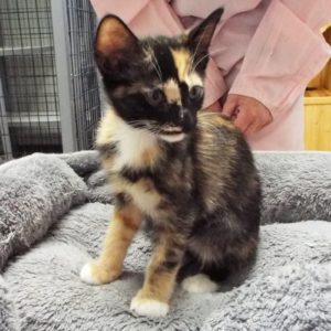 My sisters and I were found by a lady and brought to The Animal League as small kittens. We went to live with our foster mom, who had a hard time telling us apart! We are all what she calls “tortico,” mostly darker torti markings but with white (like a calico). I am the darkest sister, with cute black paws and white toes. I love people and being petted. Don’t believe my little sister, I am an active angel who just likes to explore. I liked to sleep up against mom’s leg or under the bed. Of course, I love to play! Come meet us all and let us charm you.