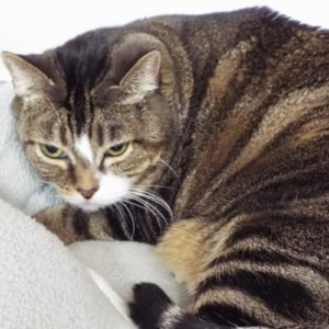 Dad passed away, so here I am looking for a new home. I’m a senior girl that comes with free vet care support for life. I’m a little shy but will purr when the volunteers pet me. I hang out under a cat tree. I’m not used to other pets, and don’t get along well with children—but you can depend on me to use my litter box. I must be a good eater ‘cause I’m a big girl. I’ll warm up to you if you show patience. My coat is a brown, grey and white mix, with dark stripes. I’d really like to find a quiet home where I can be your easy companion.