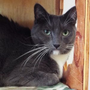 As a kitten I was adopted by a nice person, along with my bonded companion Beret. Unfortunately, our owner died so we are looking for a new home together. At first, I was a little scared, but I’m getting more comfortable here. I like to sit in a wall cubby where I can see what’s going on. I’ll meow to get your attention and I like being petted. When you do pet me, I’ll purr my appreciation. I have a beautiful grey coat with a white chin patch and white chest and feet, and I like being brushed. If you believe that two cats are the way to go, please come meet me and Beret.