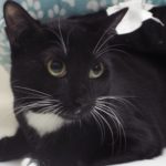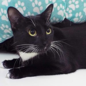 About a year ago I was found as a stray kitten and went to a loving home. I developed some health issues and was brought back to The Animal League for care. Now I’m doing better! My humans say I’m very social and I certainly demonstrate that here, coming to greet any visitors and following them around. I will chirp and squeak and I like petting, but I’m not a real snuggler. Playing is what I love, especially donut bowling and fetch. String toys are another hit with me. I have a sleek black coat with white on my chest and white whiskers.