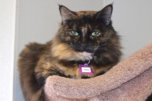 Life’s ups and downs can be really stressful for us felines, and it took me quite some time to feel safe at TALGV. Frankly, I was really frightened upon arrival, but am adjusting nicely now. My mom said that I’m a sweet lady who gets along with adults and other cats (no kids), am “safe around birds” (in case you have a few flying around in your house), and that I enjoyed a spot of Ensure every day (we can share!). She said that I only ate dry food and that my belled collar was my “security blanket” talisman that kept me safe! I’m a sweet, tortoiseshell lady who’s recovering from the pain of losing the only home I’ve ever known, but with patience will adjust to a quiet new life with you.