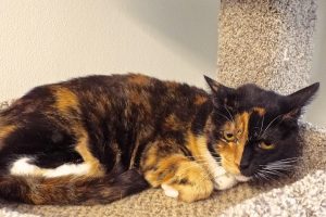 Can’t decide between an orange or a black cat? Well, you can have both with me ‘cause with my split-down-the-middle face, it depends on which side you’re seeing! Like many calicos, I can be shy at first (especially now, when my life’s been turned upside down), but after a while, my sweet personality will come shining through. I lived with a dog and got along fine with him, but I’ve never lived with cats, so maybe that’s why I’m a bit withdrawn right now as there are oodles of them here! I’m a 10-year-old lady with vet care support, and I’d sure like to start a new blissful and stress-free life with you!