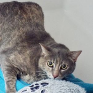 After mom passed away us four cats were too much for dad to care for. We all came to The Animal League hoping for a new beginning. I’m a little frightened right now in my new room, and I’ve been hiding out down low on the floor underneath a cat tree. However, the volunteers come around and can stroke me with a wand toy and I play a little. The brush scares me but I am curious about it. If I were to land in a quieter home with a patient human, I think I would come right out of my shell. Give me a chance?