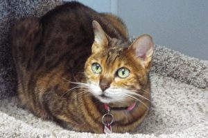 Purebred Bengal. Declawed. Super sweet. Huge voice. Bed buddy. What more could you want? OK — I don’t get along with other cats very well (that’s mainly why I’m here – that and my dad’s health), so I’m inviting you to add lots of zip to your life and take me home. I have the most luxurious velvety fur you’ve ever felt, with beautiful orange “rosettes” (apparently a characteristic of some Bengals), and I’m just as sweet and playful as can be, even at 10 years of age (which entitles me to Vet Care Support for Life). There won’t be many opportunities to snap up a lover like me, so you’d better get a move on!