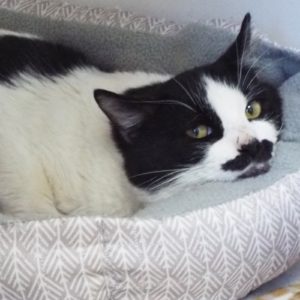 My buddies and I were found outside, and after being fed awhile a nice person brought us to The Animal League. One of my buddies has already been adopted! I’m hoping my turn comes soon. I’m a solid boy who likes lazing on the top perch of the cat tree in the catio. You can rouse me for petting and brushing but otherwise I’m pretty chill. Maybe I’m just worn out after surviving outside! My coat is black and white, and I have the cutest chubby black cheeks and mustache. How about coming to meet me to see if we can make a go of it?