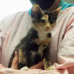 My sisters and I were found by a lady and brought to The Animal League as small kittens. We went to live with our foster mom, who had a hard time telling us apart! We are all what she calls “tortico,” mostly darker torti markings but with white (like a calico). I’m the smallest, and the shyest. I love people and will tuck my head around so you can scratch my chin. Mom says I’m sweet and well-behaved, unlike my sisters who get into everything. I liked to sleep up against mom’s leg or under the bed. Of course, I love to play! Come meet us all and let us charm you.