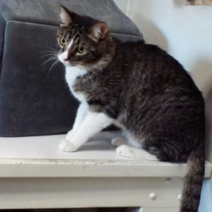 Left behind—that’s me. When a new owner came to their home, they found me! Needless to say, I wasn’t part of the contract. So here I am, looking for a home. I’m very shy and have been hiding under a blanket. I’m just not used to this, I guess. The volunteers are growing on me, though, and I enjoy being petted and brushed. I’m mostly a black tabby but I have some white on my face and paws. I could use a patient person who will help me transition to a permanent home. Can you come meet me and get to know me?