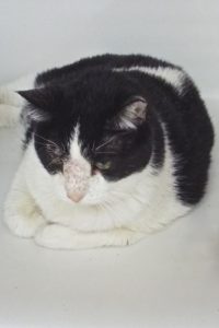 Well, it was good while it lasted! I lived in a home with children, dogs and cats for almost all of my life. I was good with the kids but not so much with the other animals. I’m a big tuxedo girl who likes petting and am very loving with people in general.  You can see in my photo some marks on my nose; we’re not sure how that happened but I’m getting it cared for. I would dearly love to find a home where I can be the one-and-only pet. With my senior status I come with vet care support for life, which is one more reason to come check me out!