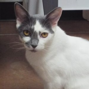 My buddies and I were found outside, and after being fed awhile a nice person brought us to The Animal League. One of my buddies has already been adopted, and I’m hoping my turn comes soon. I’m a petite girl who likes lazing on a perch of the cat tree—but I’m active and playful at other times. I’m young! My coat is mostly white with grey patches, and I love chin and ear rubs. How about coming to meet me to see if we can make a go of it? Look into my coppery gold eyes and say yes!