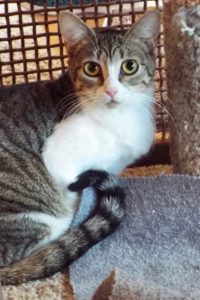 I was part of a large group of strays that were found together. Thankfully we all came to The Animal League where an exceptional volunteer worked with us every day to get over our fear. I’m still a little shy but I can be petted and brushed. While I’m not cuddly with humans (yet) I really like some of the other cats here and cuddle with them. I have a pretty white coat with grey tabby spots. I am young and active and need a home where I can continue to learn to trust people. It would be great if I could have another cat to be my buddy and we could entertain you together.