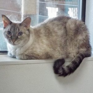 Here’s the deal. Mom passed away so I’m at The Animal League now. It’s okay! I usually sit in a windowsill or in the outside catio, and the volunteers know that sometimes I like brushing, petting and scratching. However, I don’t like laps or being picked up — I really like my own space, and I can be cranky about it. My coat is light grey with stripes, and my Siamese side comes out in my blue eyes. I’d really like a chance to live in a quiet home for my senior years. I come with Vet Care Support for Life, so don’t let my senior status stop you!