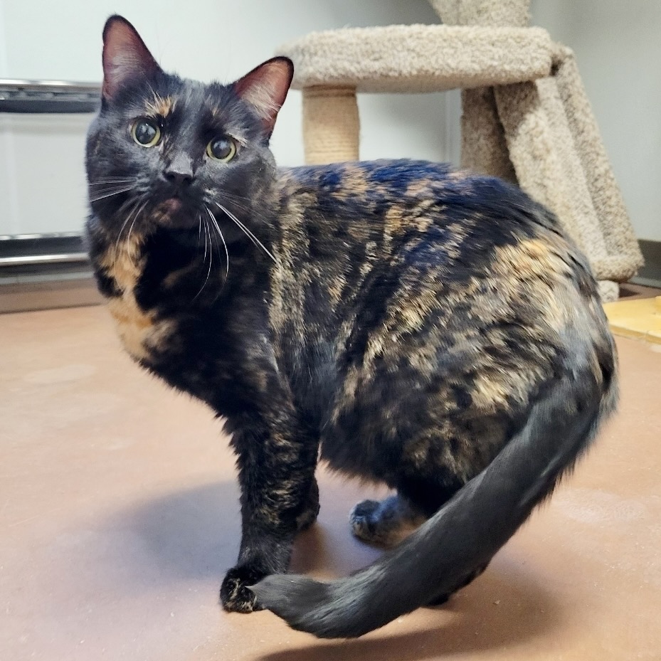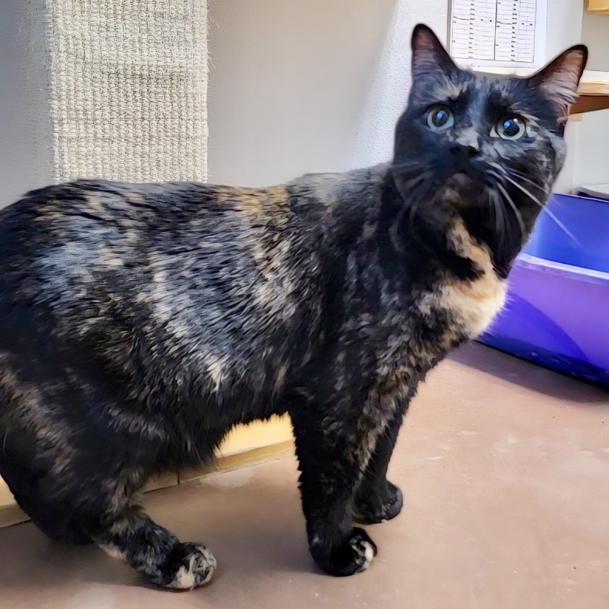 Oh, Sister Sweetie Pie! I heard you — we’re at The Animal League because our people could no longer care for us. We need a new home, pronto! We’ve lived with a dog and another cat, so a multi-animal home is okay with me. I’m a friendly sweet girl who is gentle with children. You can string me along and I will play with you like a kitten. Did I mention that I love warm laps? A volunteer described me as a “tuxedo tortie” because I have an orange patch of fur on my chest. Come see for yourself! Do you have room for me and (possibly) my sister?