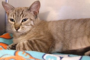 When I first arrived with my friend Turvy, everyone thought we were kittens we were so small. Well, size doesn’t always tell the whole story, as apparently we’d both had babies of our own (just goes to remind you that we felines can have kittens any time after six months of age, so spay, spay, spay!!), but it turned out I’m actually about a year old (but certainly still fit the “kitten” category!). We were wandering the Los Arroyos neighborhood and were taken care of by a nice lady who kept our babies but just couldn’t manage us, too. I’m a beautiful combination of Siamese and silver tabby, and if you think a small, blue-eyed charmer would fit your life style (and lap!) then I’m the “real deal”!