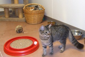As the remaining kitten from the “Bird litter,” I’m here to tell you that you’re missing out on a heck of a good time watching me grow up! Our mom (“Birdie” of course!) raised us all in a shed for the first weeks of our lives, but since we had a human feeding and socializing us (thank you human!), we all turned out to be just as friendly and happy-go-lucky as any kitten raised indoors. I’m a classic tabby boy who promises to be the focal point of the day as you help me mature from a typical “into everything” kitten (one of the best parts of kittenhood!) into a lap cat/companion par excellence. C’mon … you know you want to, so adopt me now!