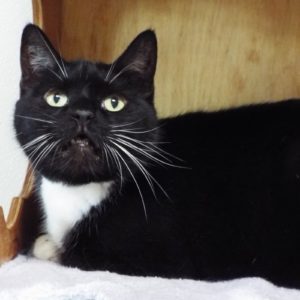 Mom couldn’t care for us any longer so here we are! My buddy Tater and I are true lap cats, she says. I also lived with a dog but we didn’t get along.  I have good habits: eating almost anything, using the litter box without fail, and enjoying mom’s grandkids. Usually I sleep on a cat tree or a higher perch, but I seek out people and am very loving.  I’m pretty calm and quiet, and like being petted.  My coat is glossy black with white whiskers, boots and chest. I’m a large boy with lots of love to give!  Won’t you come meet me and see if we are ready for a move-in?